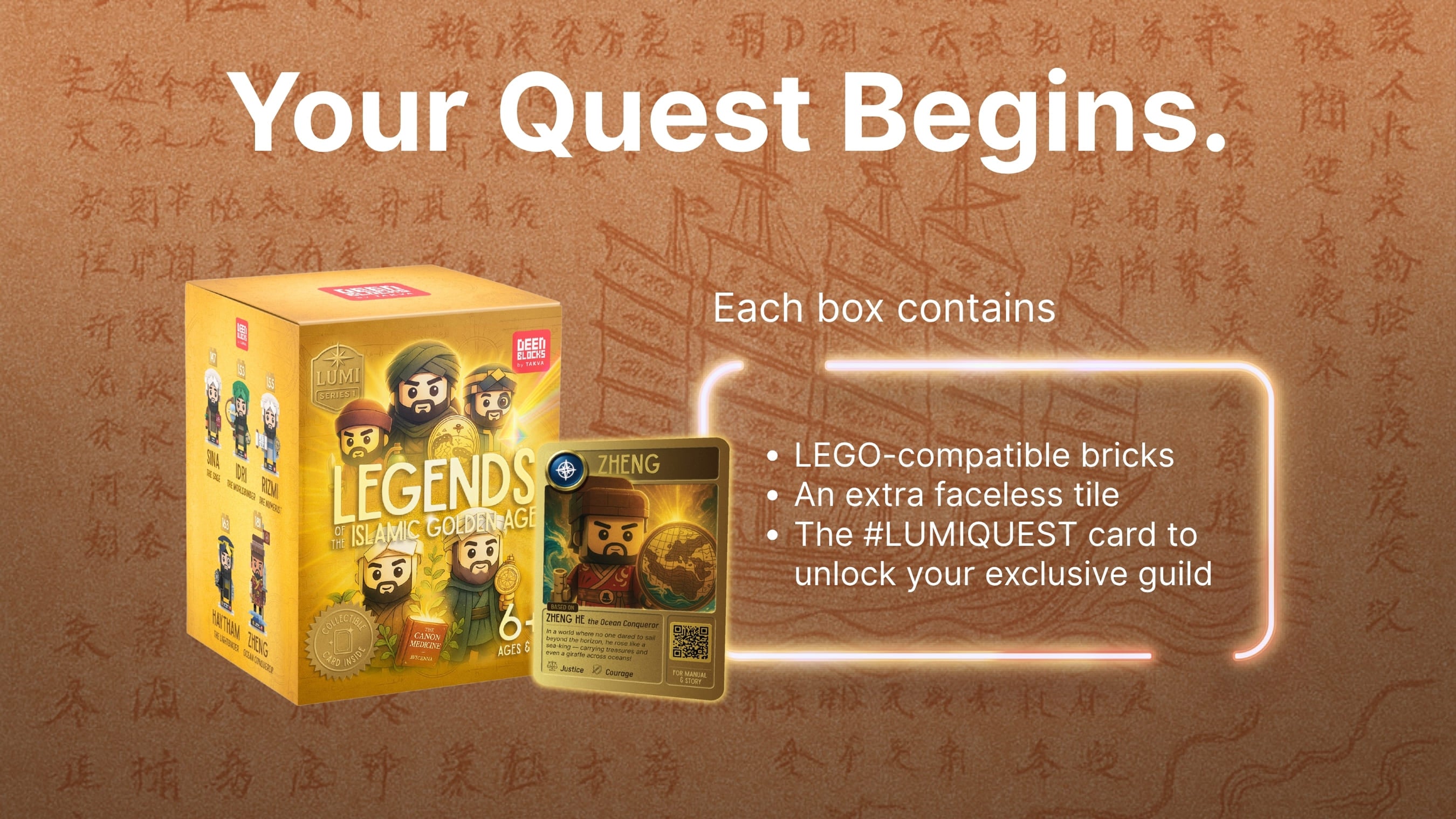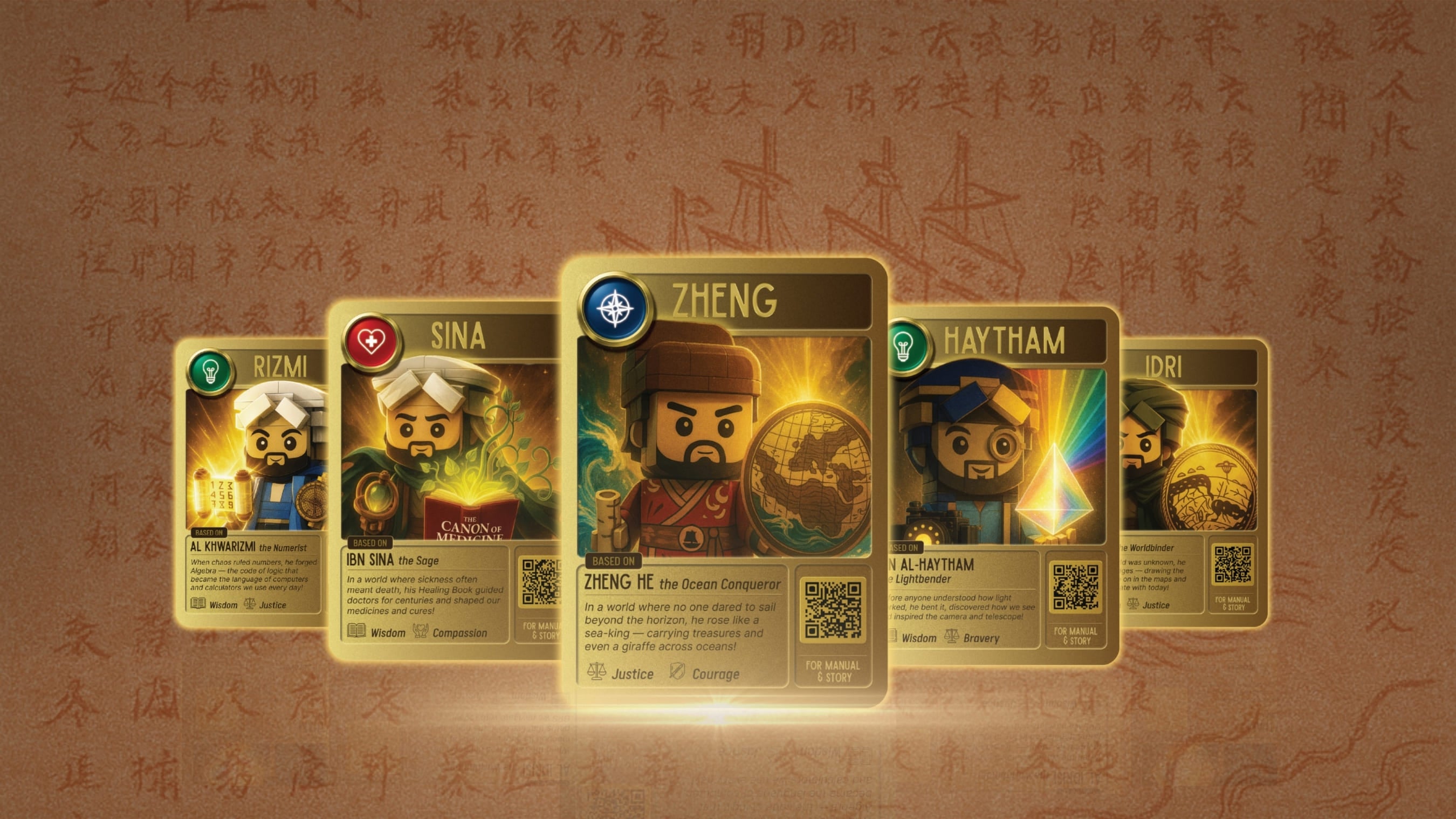 Open the box, build the figure, then scan the QR to open a simple manual and a short profile about Zheng He. Clear wording helps kids remember the key points.